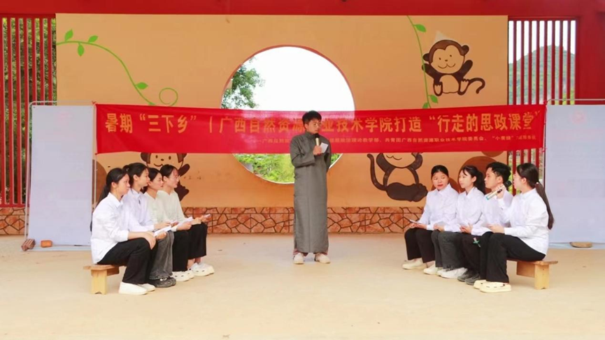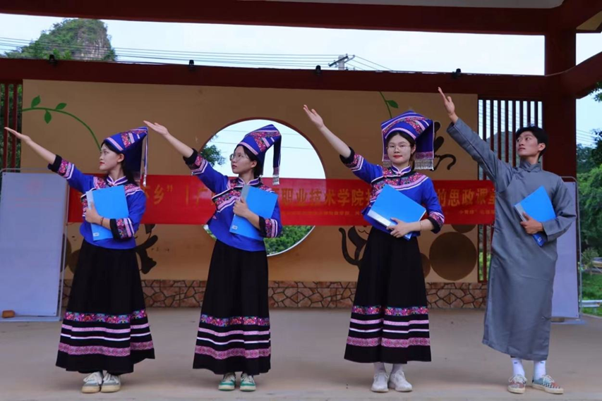 以志愿服务为基础,将“思政课堂”搬到院坝房间,田间地头,猴乡戏台,打造出一堂行走中的“大思政课”。老师、志愿服务队成员们用情景表演、诗歌朗诵、主题演讲、专题教学等接地气的文体形式,群众喜闻乐见的方式,与边疆民族地区的群众“面对面”交流,“零距离”沟通,引导他们在“四史”学习教育中坚定“五个认同”,铸牢中华民族共同体意识。