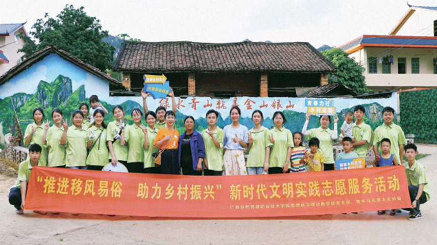 为弘扬社会主义核心价值观,共同遏制陈规陋习、树立文明乡风,2023年7月6日下午18点,广西自然资源职业技术学院青年马克思主义协会在指导老师张露、傅冉思垚的带领下,前往崇左市扶绥县山圩镇昆仑村渠楠屯开展“推进移风易俗•助力乡村振兴”新时代文明实践志愿服务活动。